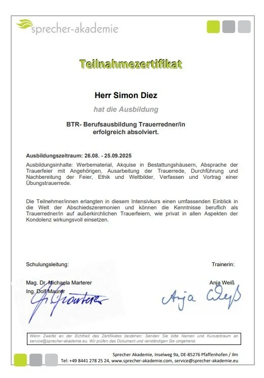 Deshalb gehe ich meinen Weg auch als Trauerredner. Mit Einfühlsamkeit, Achtsamkeit und sprachlicher Klarheit möchte ich Ihnen eine Rede schenken, die trägt.